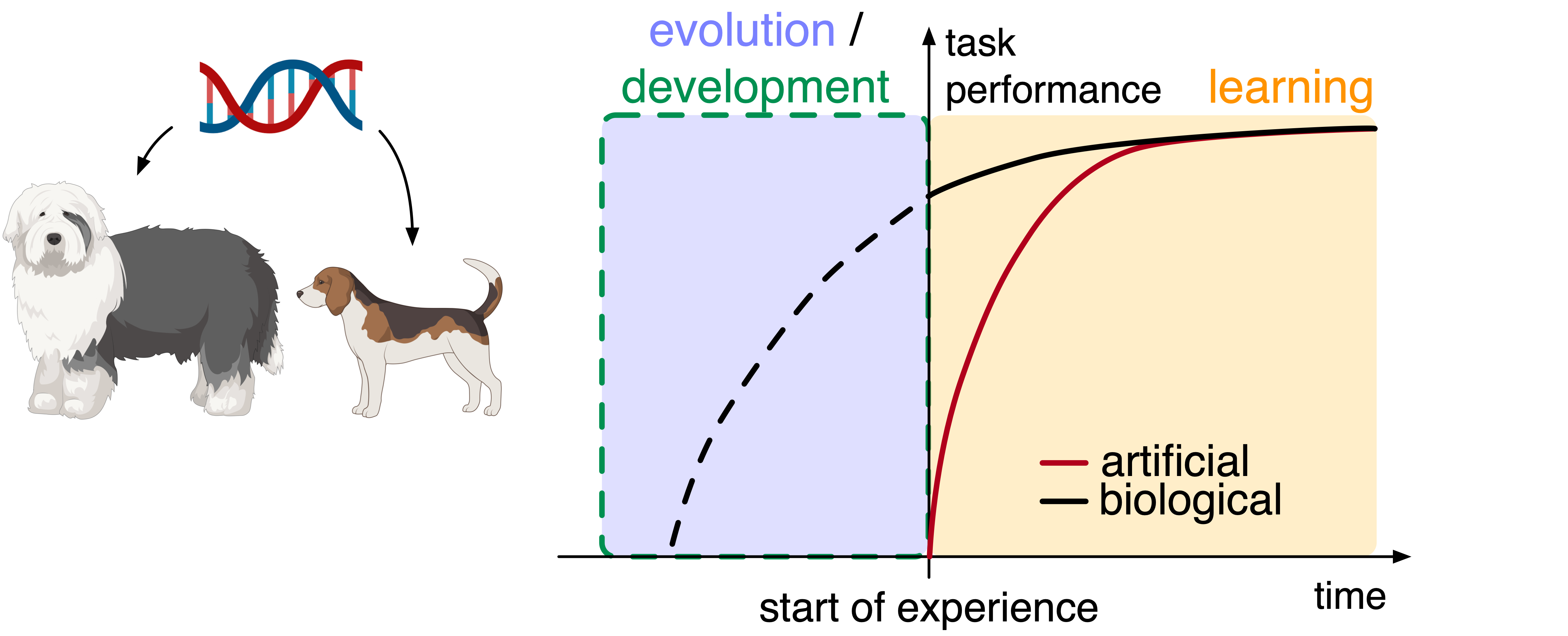 Building ML models inspired by neuronal development and evolution: Deep neural networks are trained on billions of data samples, while biological networks are able to learn within a few training examples by leveraging innate priors encoded in an organism’s genome via evolution. The importance of structural priors is well-known in ML, but a scalable mechanism for learning useful priors does not exist. Biology makes use of two processes for finding innate structure—neuronal development, which translates the information encoded in the genome into a functional network of neurons, and evolution, which mutates the genome to produce better networks. I study these processes through a computational lens to build AI models endowed with prior structure. In turn, these models are more sample-efficient and consume less energy to train.